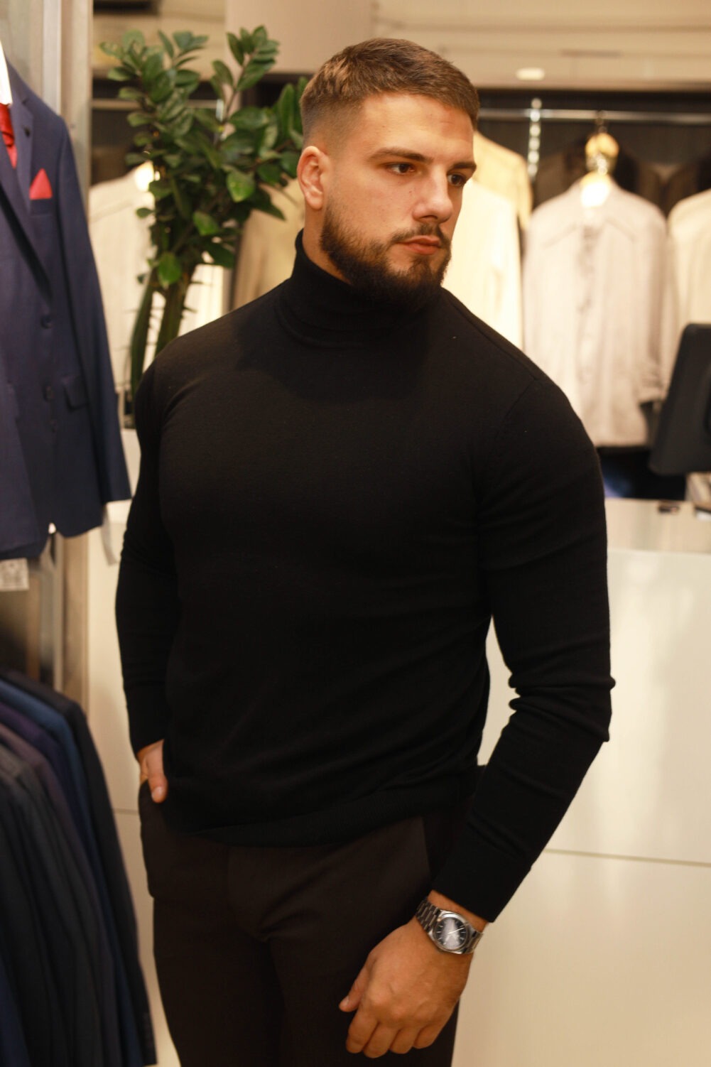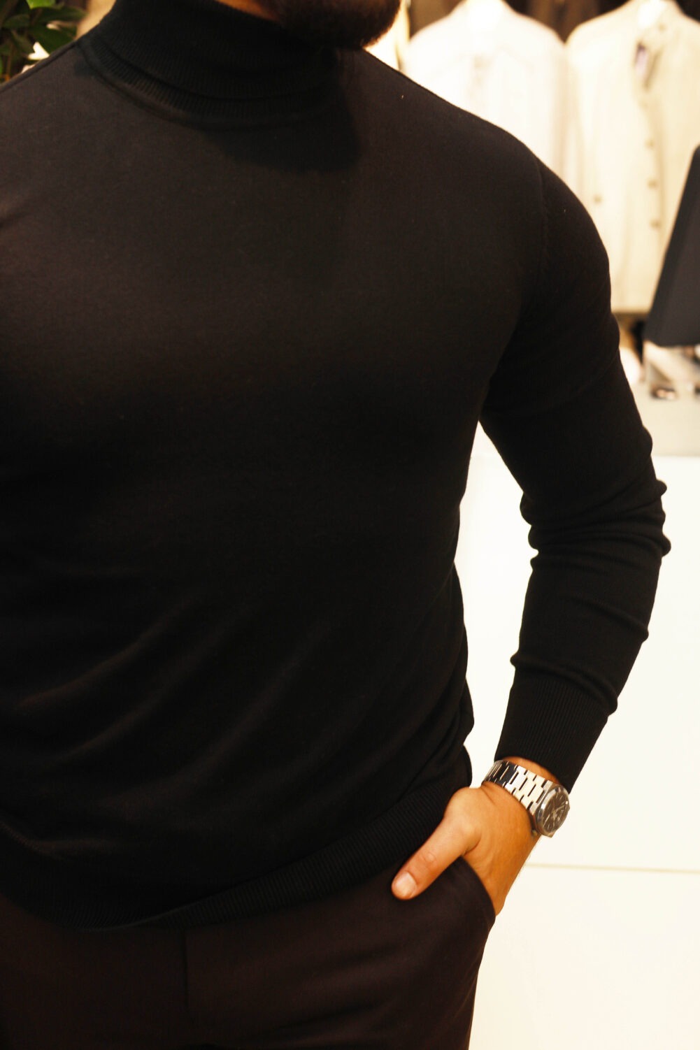 Minimalistička crna rolka sa elastičnim, glatkim pletivom pruža čist, sofisticiran izgled.