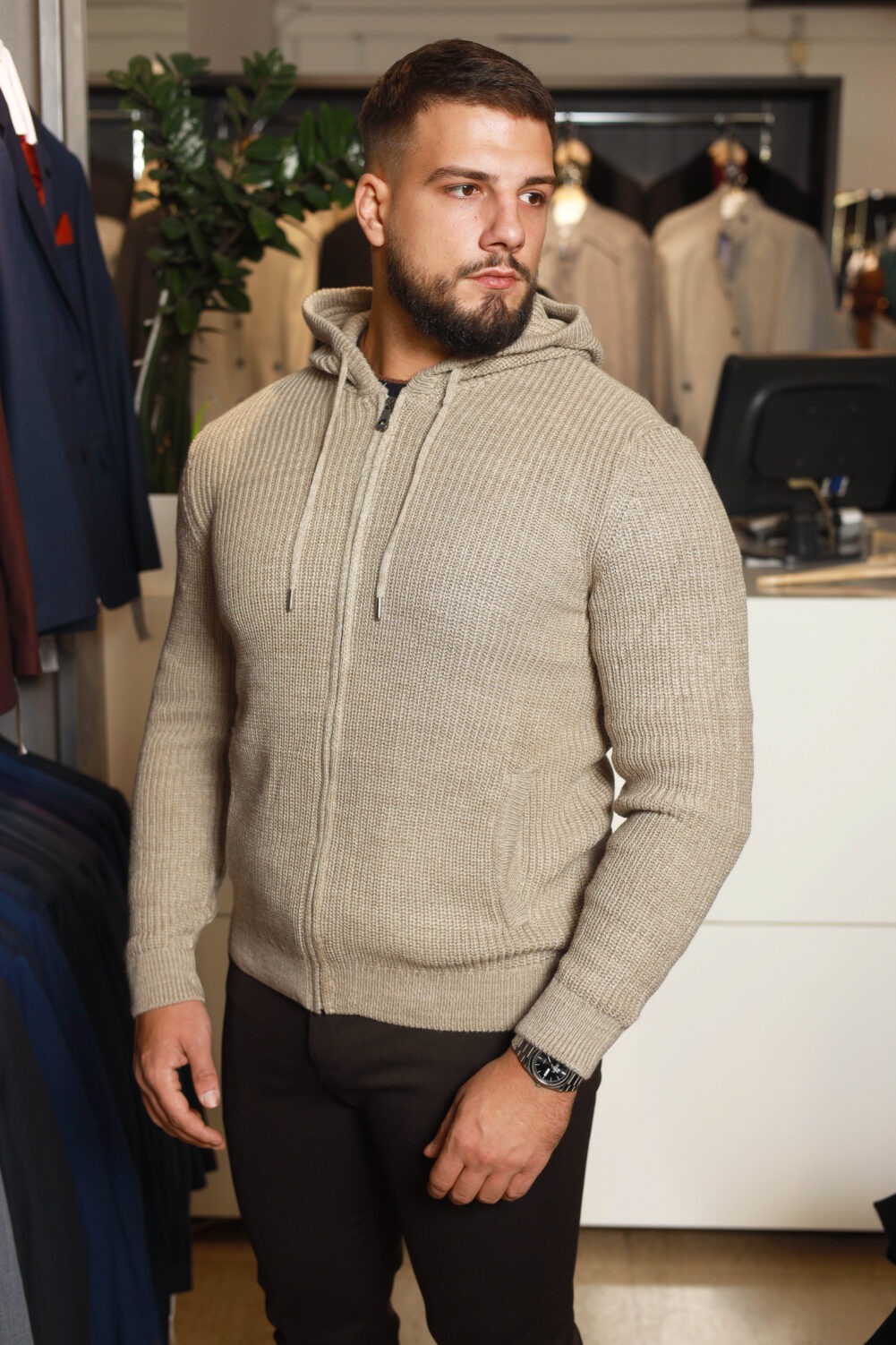 Udobna pletena jakna u toploj krem nijansi sa kapuljačom, punim rajsferšlusom i praktičnim džepovima.